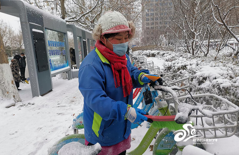 受冷空气影响,12月29日凌晨开始,潍坊市区迎来入岁末瑞雪,本次降雪持续时间较长,并伴随寒潮降温、道路结冰等情况。为保障市民绿色出行,市市政公用事业服务中心提前启动公共自行车防雪减灾预案,并做好专项工作部署。