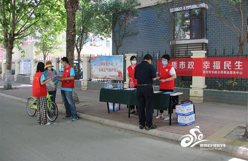 5月26日,潍坊公共自行车志愿者走进樱北社区开展“品质市政进社区 绿色出行暖民心”主题志愿活动。工作人员通过发放绿色出行倡议书、向市民介绍扫码租车骑行明白纸等方式宣传低碳生活绿色出行理念,对市民有关租车卡办理、设施维护、站点设置、扫码骑行软件使用等问题,志愿者们逐一进行解答。