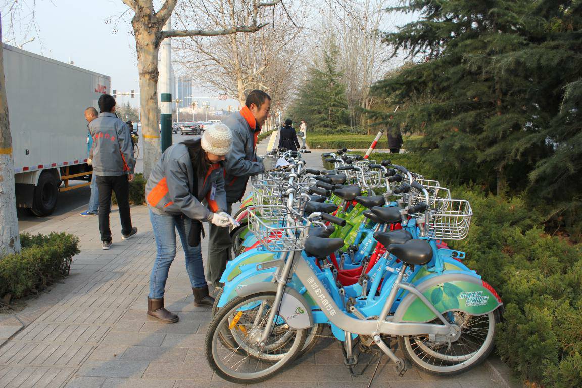 图1:工作人员在为骑行植树活动调度准备自行车,擦拭检查车辆情况